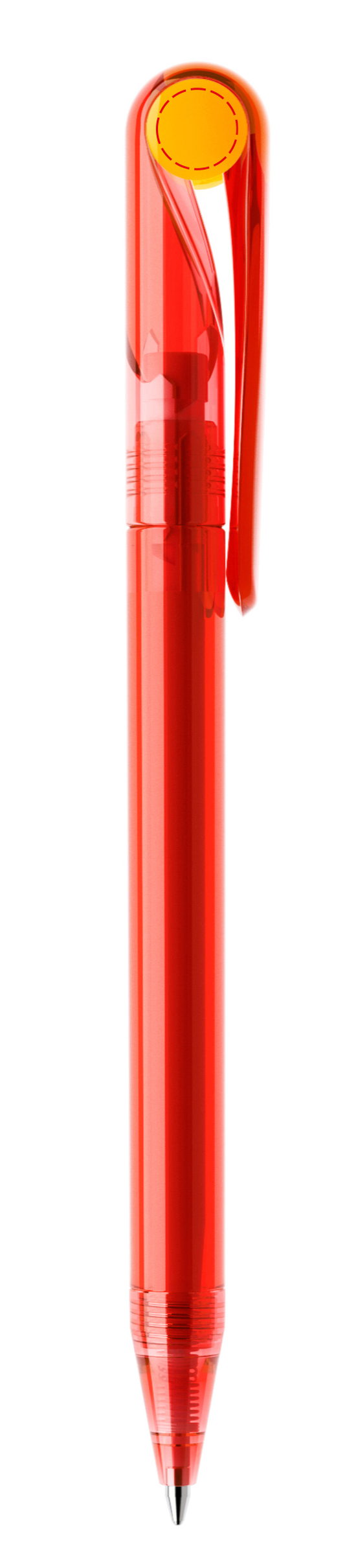 Mit seinem schlanken Gehäuse und der formschönen Kappe, die schwungvoll in den eleganten Clip übergeht, ist er ein Klassiker des Schreibgeräte-Designs. Wo die Kappe in den Clip des DS1 übergeht, lässt sich ein farbiger Punkt setzen. Oder man lässt die Form ohne Punkt einfach ihren Schwung ausleben. Ganz ohne Punkt und Komma. In der Ausführung mit transparentem Gehäuse und polierter Metallspitze (TTC ) lieferbar in sechs Standardfarben, hergestellt mit einem Rezyklatanteil von 50%, gekennzeichnet mit dem internationalen Recycling-Symbol. Sondergehäusefarben ab 10.000 Stück. Fünf Druckflächen für Werbeanbringungen stehen zur Verfügung. Der optionale Kappenpunkt ist auf beiden Seiten in fünf Farben bedruckbar. Ausgestattet mit der umweltfreundlichen auswechselbaren FLOATING BALL® lead free-Großraummine 1.0, Schreiblänge 5.000 m, Schreibfarbe Blau oder Schwarz.