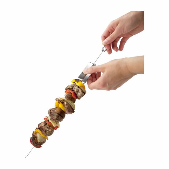 Zwei lange, elegante BBQ-Spieße mit praktischer Schiebe-Mechanik zum sauberen Lösen des Grillguts (Edelstahl)